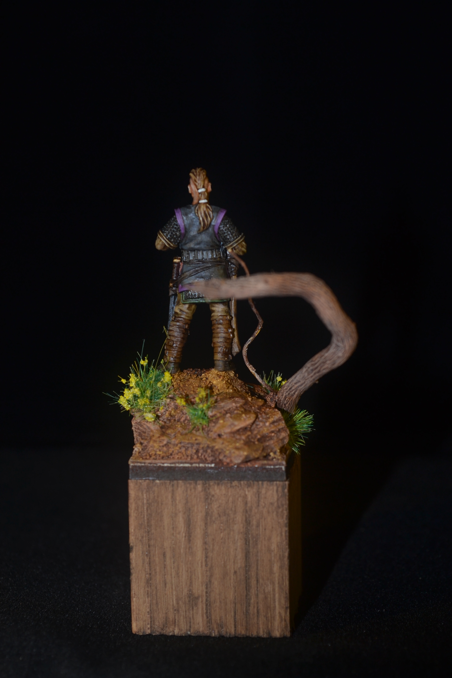 I went mostly for muted colours as theses seemed appropriate. The wolf head on his tunic was embossed so no claims to freehand on this one. Base wise I went for a simple bit of landscape comprising of a a couple of slate chippings, a bit of a twig to form a small broken tree and some Milliput and plaster board dust to complete the groundwork. Bits of grass tufts were added to the 25mm base to provide some much needed colour.